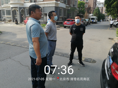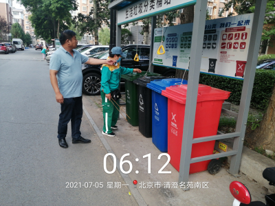 2021年7月5日,北京市城市管理委员会垃圾分类检查组对北京新科环保科技有限公司管辖的兴丰街道清城南区进行检查,公司总经理刘远宁、垃圾分类事业部经理张若岭等人陪同。